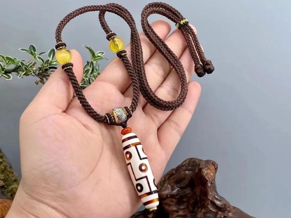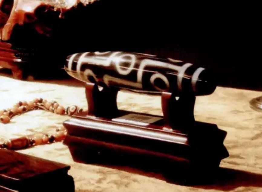 网络上存在的九眼天珠照片也多是李连杰的这一枚,珠子整体修长,纹路为棕白两色,从上到下布满了朱砂色的斑点,它的前几任主人都是藏族有名的活佛或高僧。