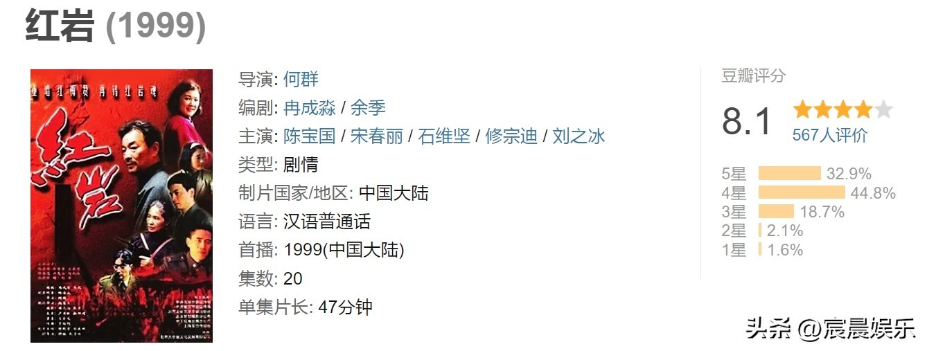 第10名,《红岩》,豆瓣评分8.1分。该剧是红色经典电视剧,根据国民党集中营的幸存者罗广斌、杨益言创作的同名小说《红岩》改编,谨以此片献给为新中国流血牺牲的先烈们。