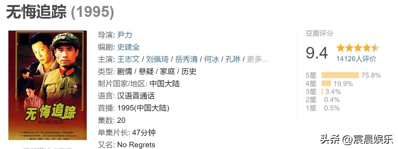 第1名,《无悔追踪》,豆瓣评分9.4分。该剧是由尹力执导,刘佩琦、王志文领衔主演,岳秀清、孔琳、李丁、郝戎、李冰冰主演的年代谍战剧。主要讲述了人民警察肖大力40年始终如一地监视潜伏特务冯静波并为此付出了巨大的牺牲;而特务冯静波在新社会的几十年中,灵魂得以洗礼,良知受到感召,终于走上了正确的道路的故事。