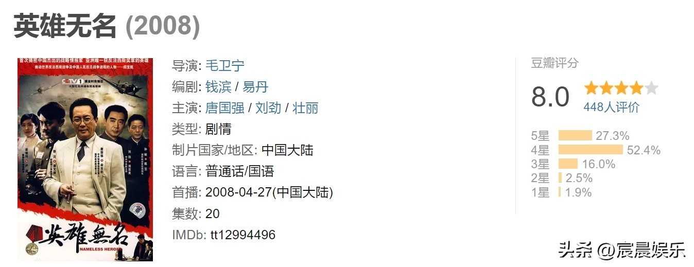 第12名,《英雄无名》,豆瓣评分8.0分。该剧是由毛卫宁执导,唐国强、刘劲、壮丽主演的战争电视剧。该剧以战略情报家阎宝航的事迹为蓝本,讲述了历史上中国共产党隐蔽战线的传奇人物、战略情报家阎宝航在抗战及解放战争期间获取大量重要战略情报,为中国人民抗日战争和世界反法西斯战争的最后胜利做出了重要贡献。