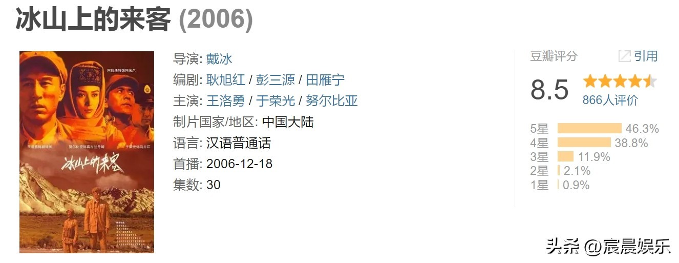 第6名,《冰山上的来客》,豆瓣评分8.5分。该剧是由戴冰执导,王洛勇、于荣光、努尔比亚等主演的悬疑谍战剧。该剧主要讲述了杨光海和马占光斗智斗勇的故事。