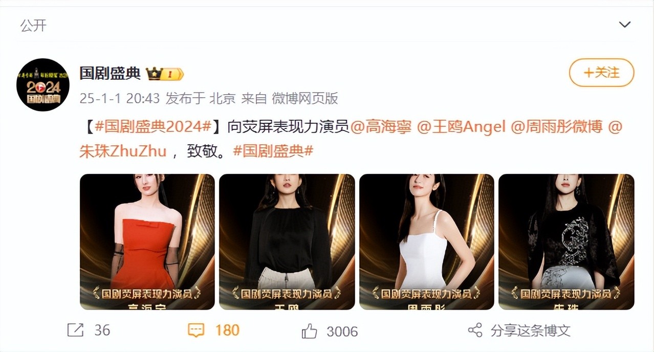 在今年开年第一天,王鸥获评2024国剧盛典荧屏表现力演员。