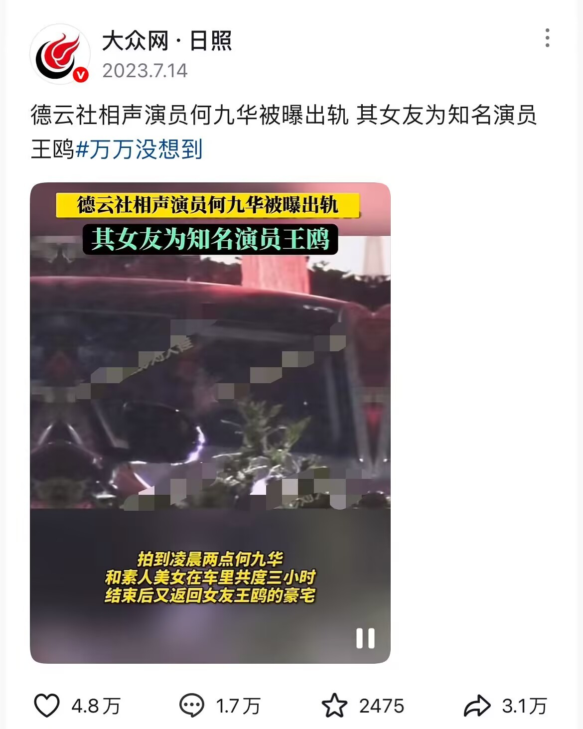 2023年7月,何九华曾被拍到与一美女在车上约会,两人独处了3个小时,举止亲密。