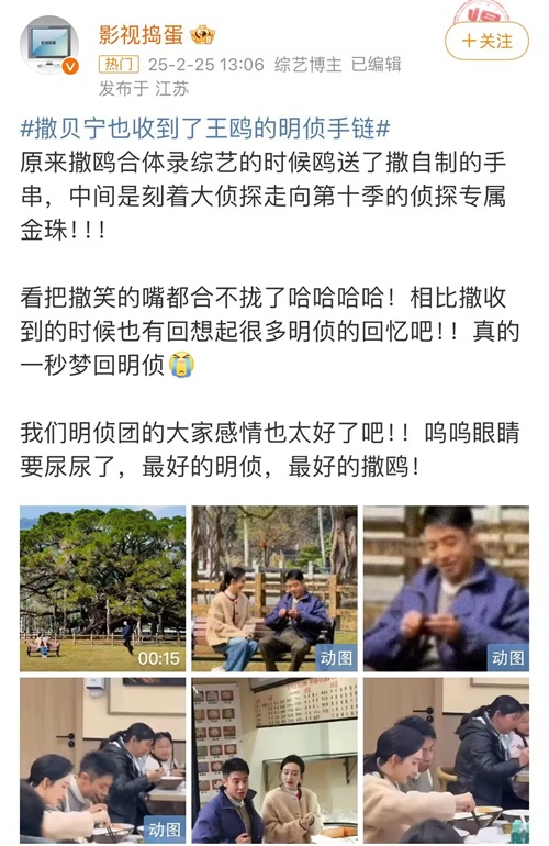 在录制《三餐四季》期间,有网友发现,王鸥送了撒贝宁明侦手链。