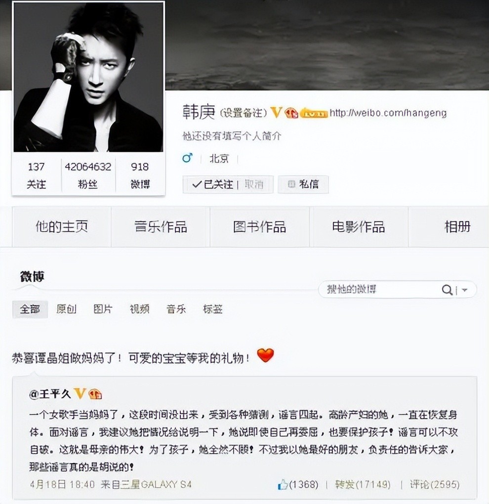 2014年明星韩庚在社交媒体上转发了词作家王平久的发文,并附上恭喜谭晶当妈妈的祝福。这才让广大群众明白谭晶为何没有出现在春晚,也让网络上的谣言平息。