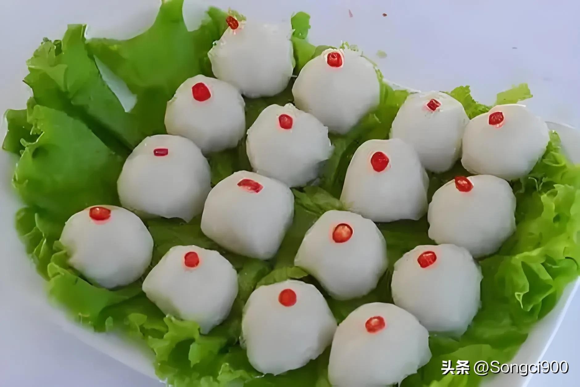 烹调方法:选用新鲜的鱼肉,去除鱼刺,将鱼肉剁碎成泥。加入适量的淀粉、盐、蛋清等调料,搅拌均匀。将鱼泥挤成丸子状,放入锅中煮熟即可。