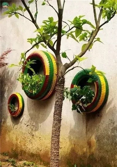不仅可以用一个轮胎做个简单的花盆,更可以多个叠加,做成组合花盆。栽植花卉或者栽植树木都可以实现。