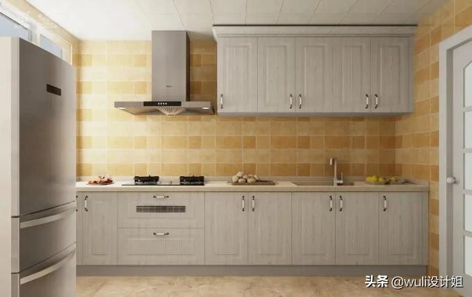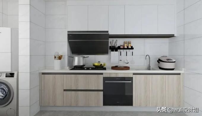 常用于小户型或单身公寓,利用一面墙打造一字型厨柜,空间虽小但五脏俱全,洗切炒动线流畅,收纳要做到最大化利用。