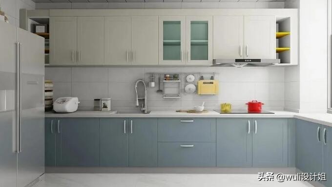 想要独具一格的厨柜色彩,这一抹优雅清新的蓝绝对值得打CALL,芦苇蓝+瑞士白的搭配,再加上收纳上墙,解放台面,这个空间通透清新。