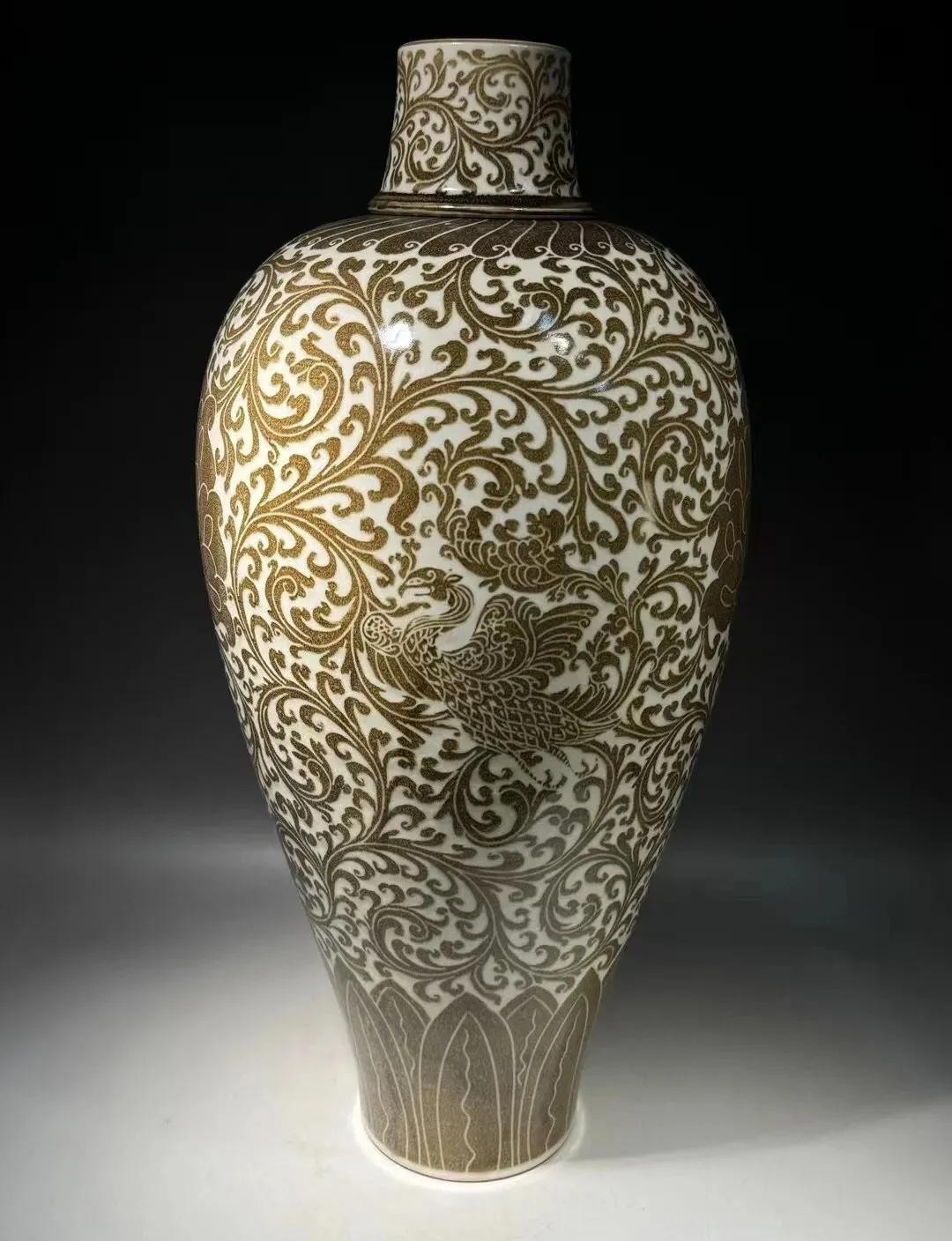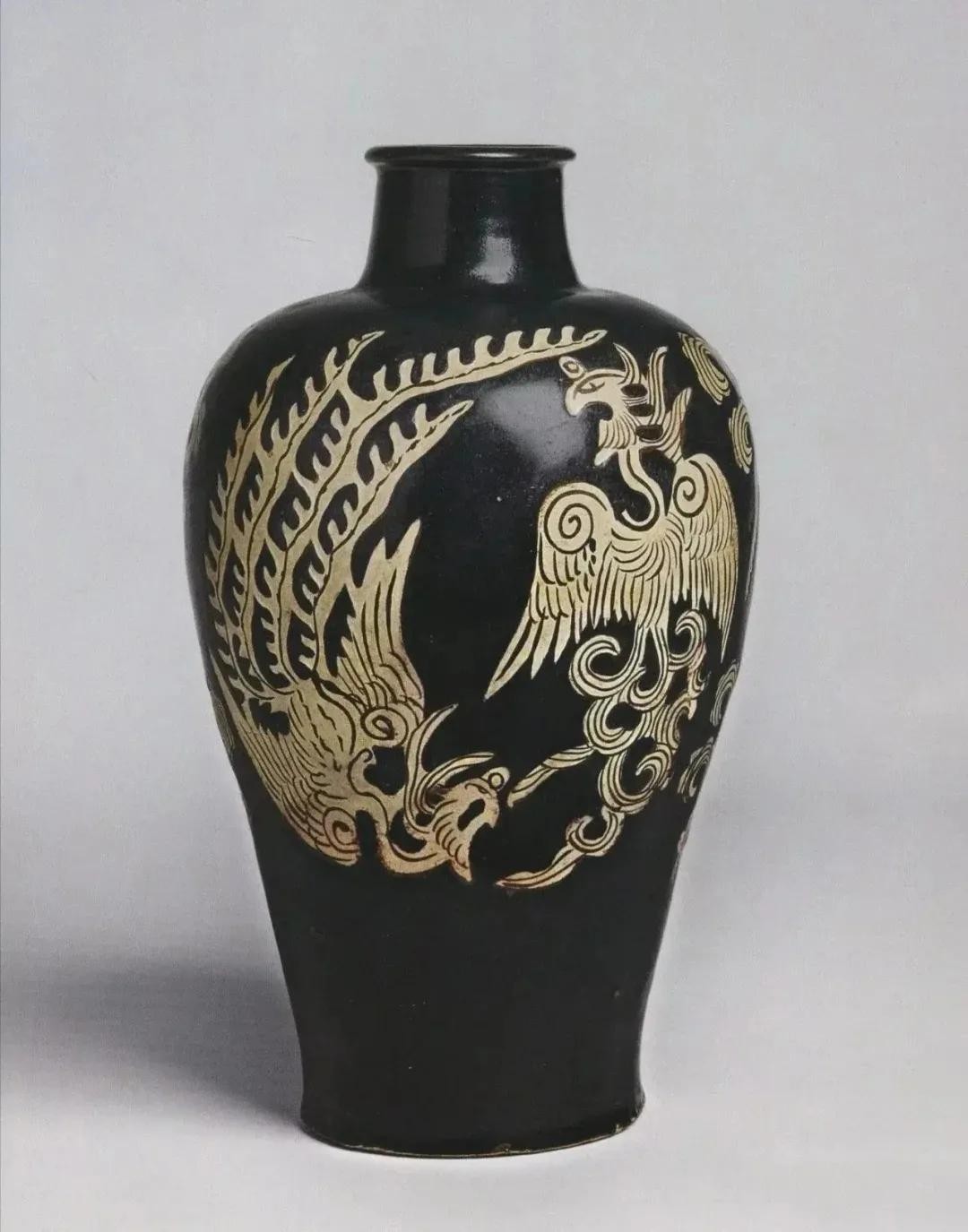 【宋 定窑剔花褐彩卷草牡丹凤纹梅瓶】