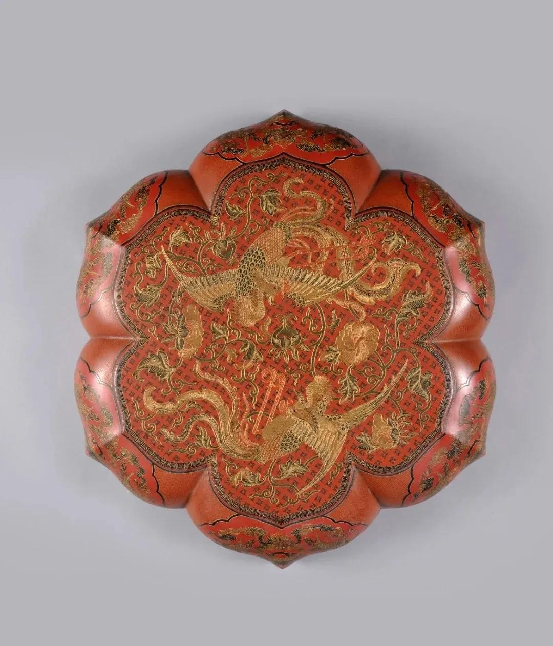 【清 乾隆 戗金彩漆双凤纹菱花式盒】