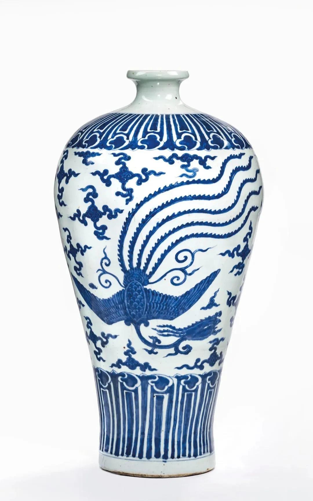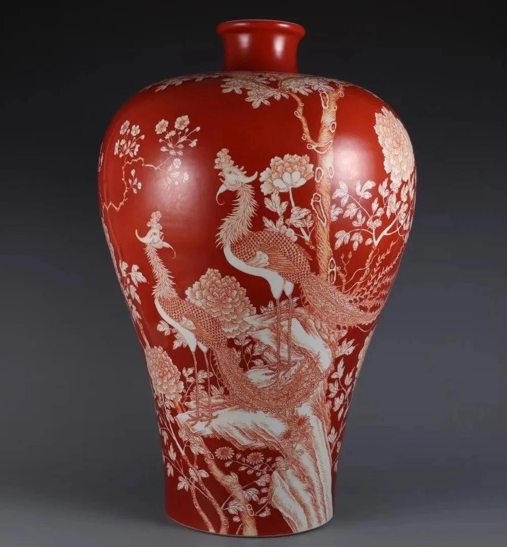 【清 雍正 年制矾红底留白凤凰牡丹纹大梅瓶】