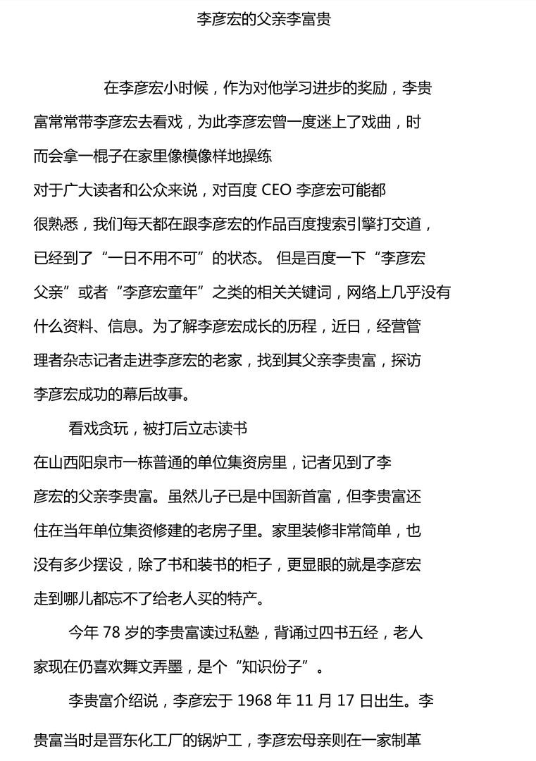 我们大家都知道百度创始人李彦宏,这个相信大家都应该知道,但他背后的这位估计就很少人知晓啦,如果没有他李彦宏也不一定能有今天的成就和现在的地位。他就是李彦宏的父亲李富贵,今天我们就来聊聊这位百度创始人背后的故事