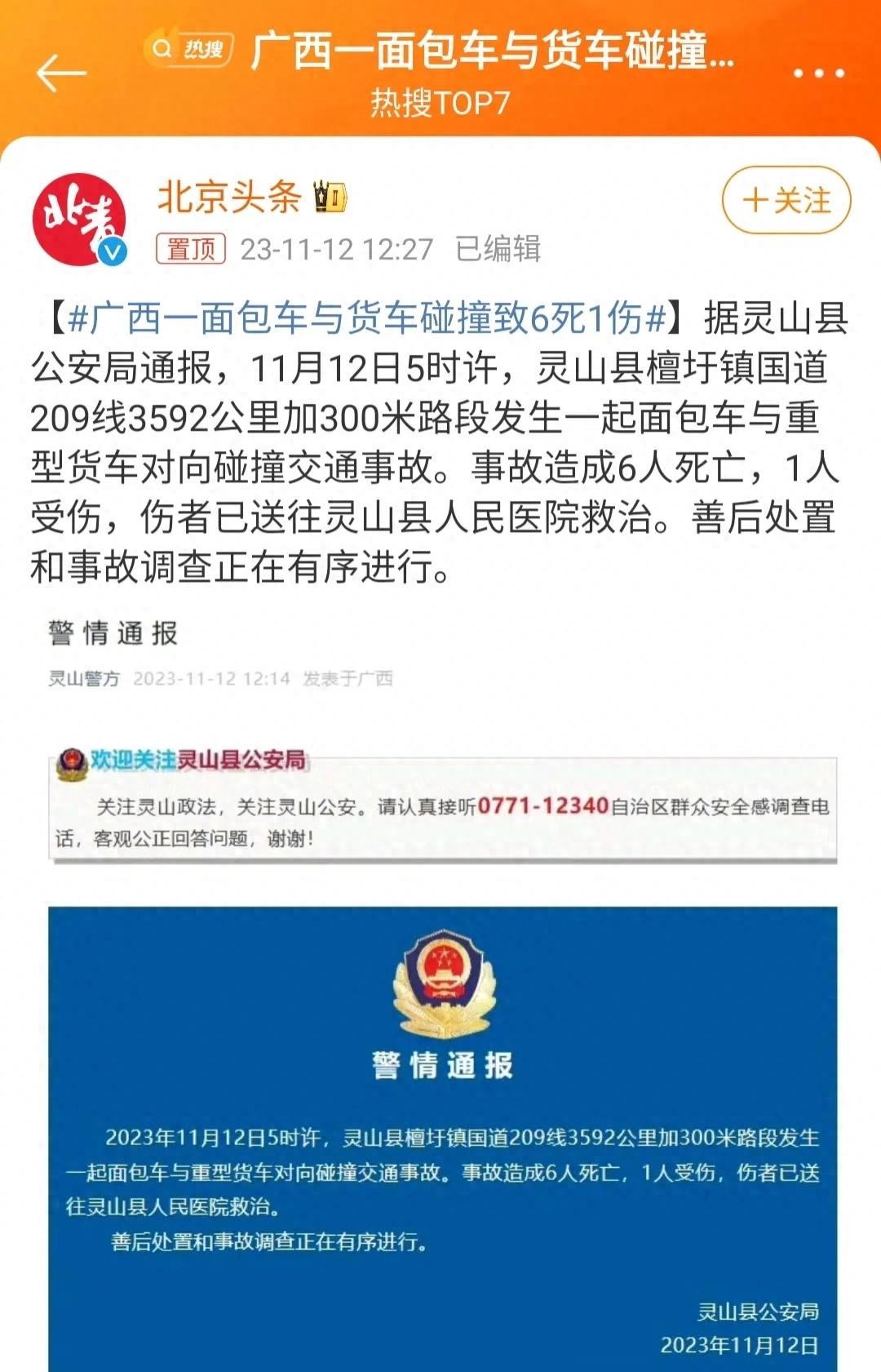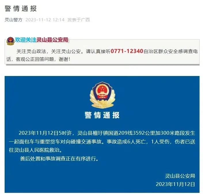 广西灵山发生重大交通事故,6人死亡,1人受伤。官方通告已出!