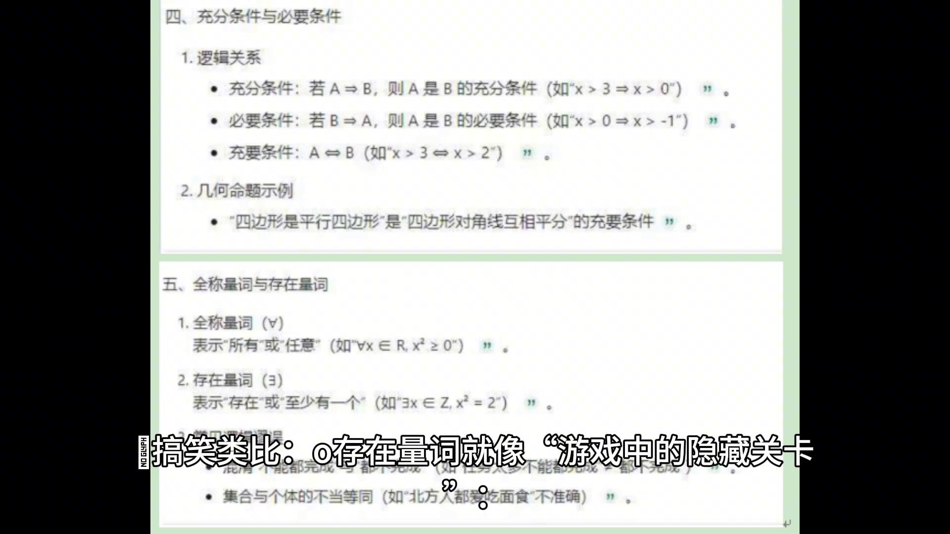 →3.存在量词(3):神秘大BOSS。定义:至少存在一个元素满足条件,比如存在实数x使x=2(,2就是那个"幸运儿"。搞笑类比:o存在量词就像"游戏中的隐藏关卡,"你只需要找到一个解就能通关!
