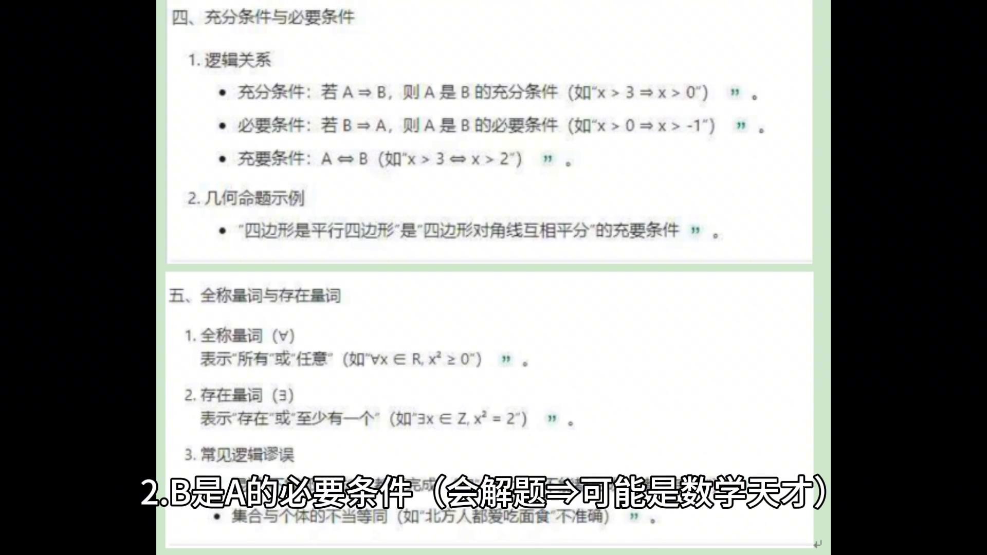 ·2.B是A的必要条件(会解题→可能是数学天才)。