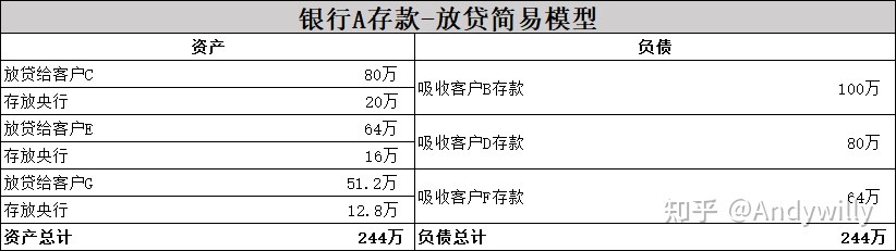 以上的模型就是我们简单计算出的1年内银行A是如何通过100万负债存款,变成资产244万,赚取了7.32万息差的简述。