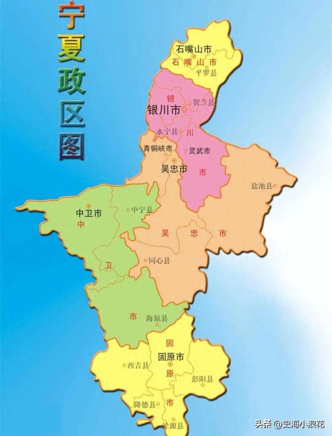 民国十八年(1929)设宁夏省,辖除固原地区及海原县以外的现有市、县及内蒙古的阿拉善旗、额济纳旗和磴口县。