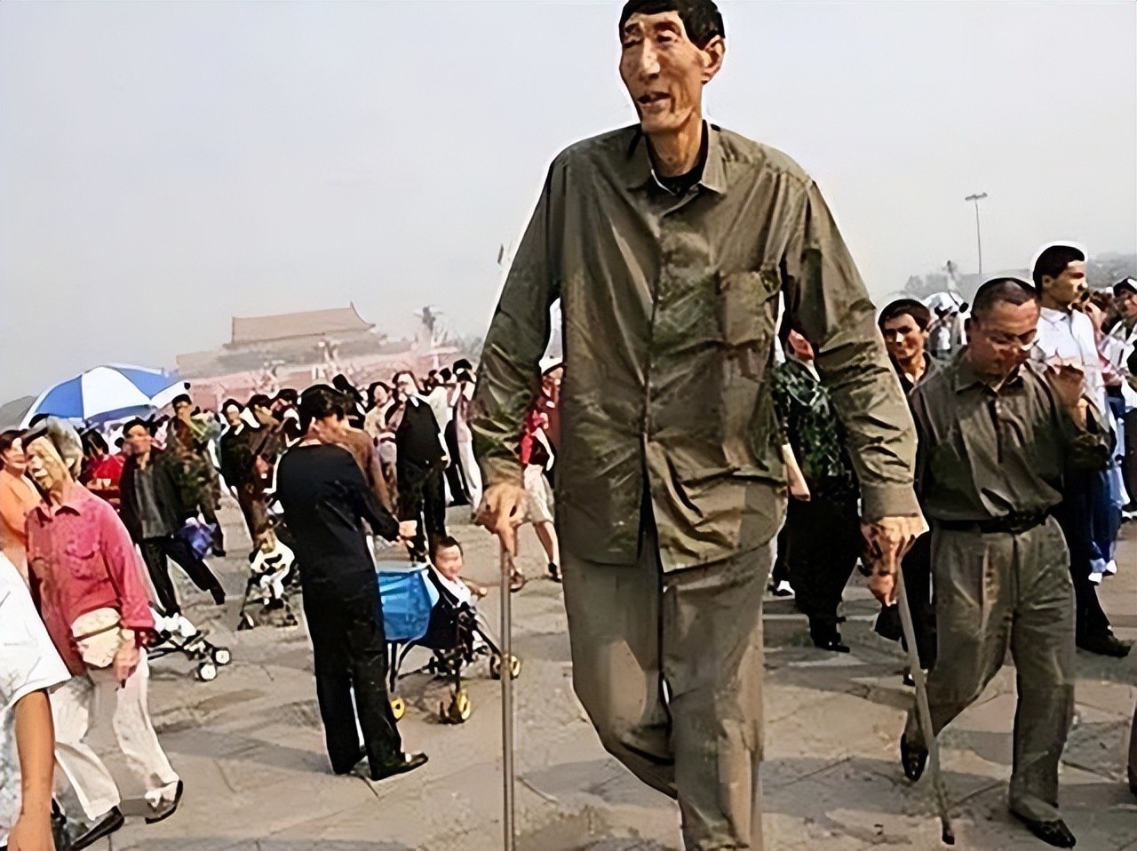 因为鲍喜顺在赤峰出了名,赤峰媒体也没打算放过这个头条,并组织了一场“巨人出游”的活动节目,那巨大的身高站在普通人旁边的震撼感,若不是亲眼得见确实很难体会。