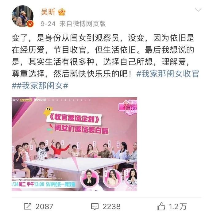 9月24日,吴昕公开发文告别《我家那闺女》。