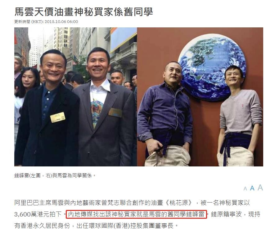 他不仅炮制讨好王菲夫妻的路子,以3600万元港币买下马云创作的油画《桃花源》,促进两人感情。