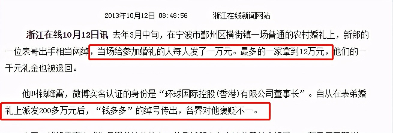 他在表弟婚礼时,退回了到场每一个人的份子钱,反倒给每家每户派发最低一万元、最高12万元的红包。整场婚礼下来,他扔掉了200万。