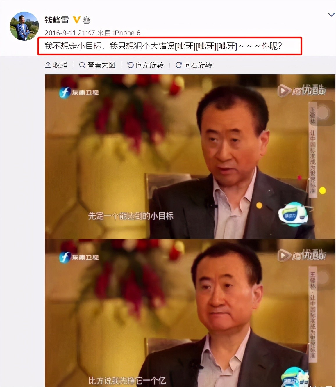 有时候,还会调侃其他大佬,比如王健林,“我不想定小目标,我只想犯大错误。”