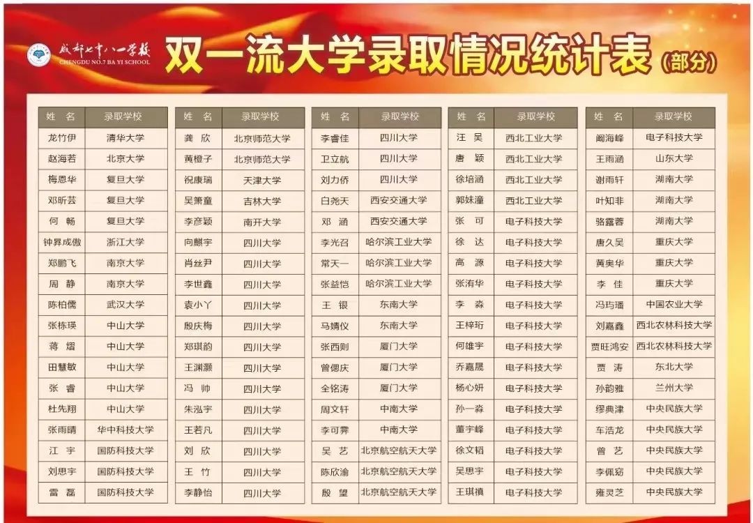 近年来,高考一本率达到四七九等一流名校水平,一大批学子被清华、北大、复旦、浙大等名校录取;中考重点率连年攀升,已跻身成都市名校之列。