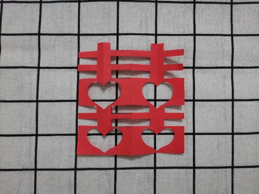 5.剪刀沿画好的图案剪下来 然后打开 漂亮的爱心红双喜就完成了