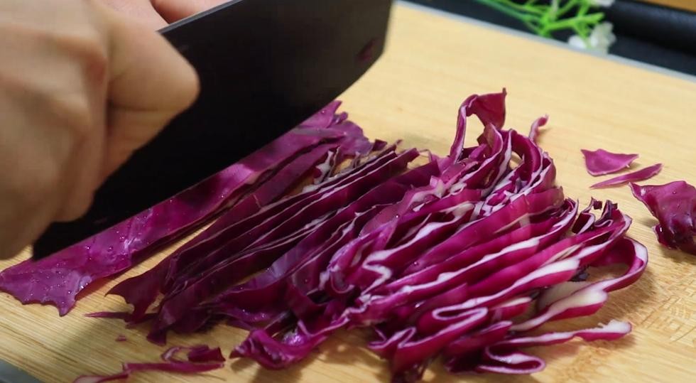 1、生菜洗净,用手撕碎,紫甘蓝切成细丝、番茄对半切来,其实蔬菜沙拉的蔬菜没有任何标准。只要是能生吃的蔬菜都可以,最好是选择应季的蔬菜,比如夏季还可以加入苦菊等等。