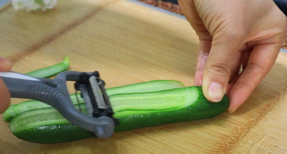 2、黄瓜想要好吃,我建议选择用小乳瓜,它的口感更加美味,黄瓜用刨片的方式,这样比切片的口感要好很多。