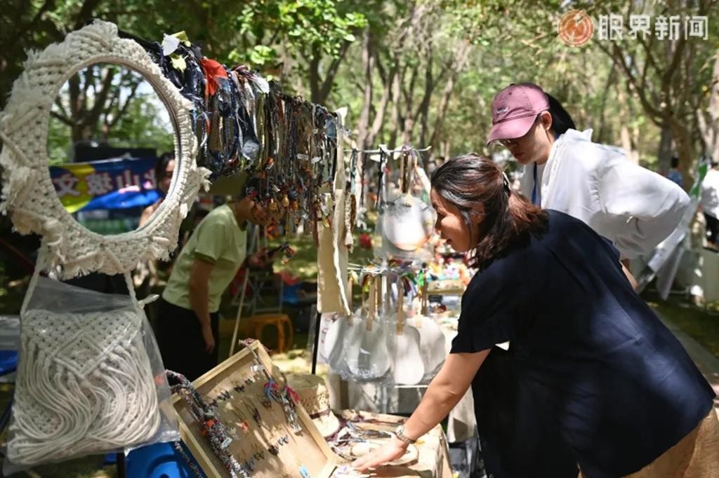6月7日,在水磨沟公园(水塔山)的“风滚草”小集上,游客在挑选扎染文创产品。资料图片