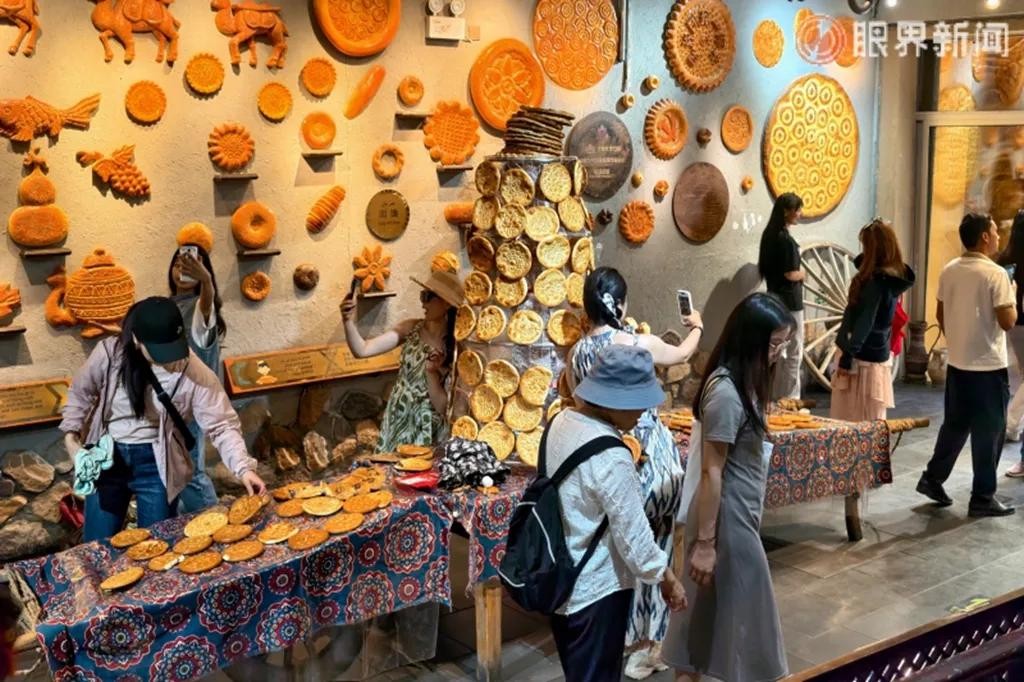 山野乡村间,人们奔赴心中的“诗和远方”;飘散着馕香的“馕+N”美食摊前,食客们排起长队;手作艺人市集上,各类文创非遗作品畅销……