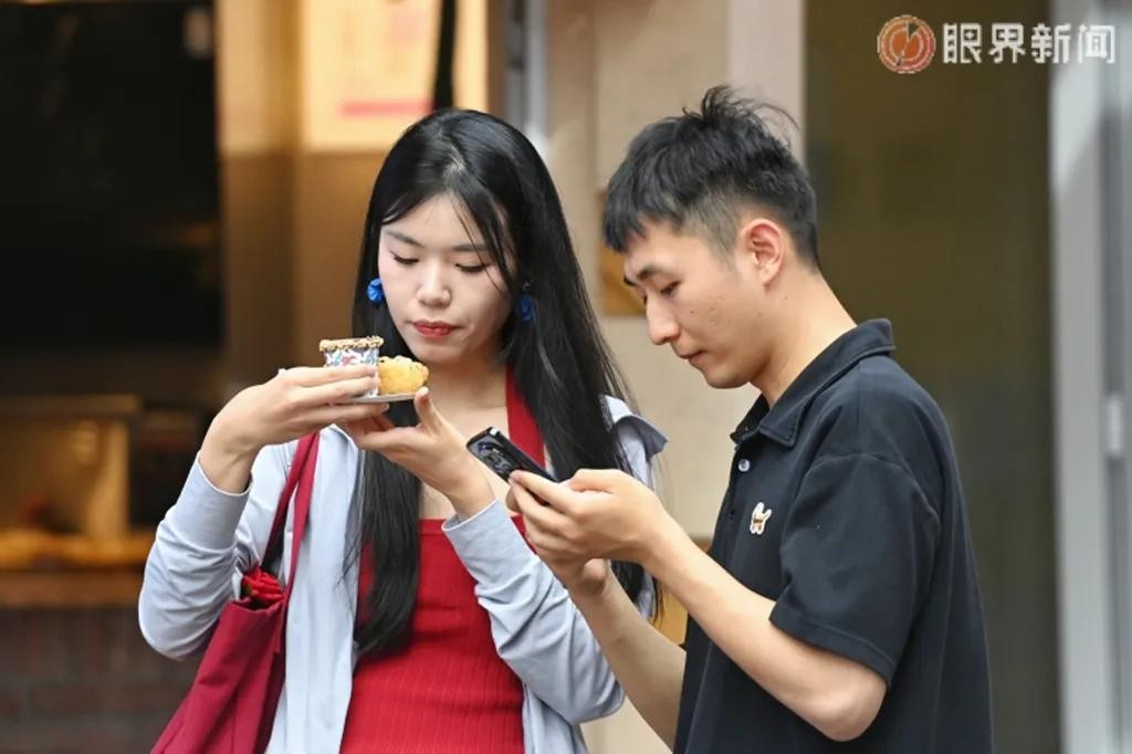 在位于卫星路外运司的博斯坎酸奶粽子新疆总店,来自湖北的游客阮仁梅和朋友一边品尝酸奶粽子,一边打卡拍照。