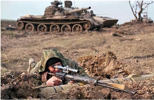 其实,早在第一次车臣战争结束后,俄军便大力开展了反狙击的训练。他们抽调了军中的优秀射手组成狙击手部队,请有实战经验的军官讲解车臣狙击手的战术,并聘请一些优秀的射击运动员来为官兵传授射击经验。俄军狙击小组通常2人一组,一人狙击,一人充当钓饵。在米努卡广场争夺战的关键阶段,俄军派出的大批狙击小组发挥了重要作用,消灭了大量车臣狙击手。