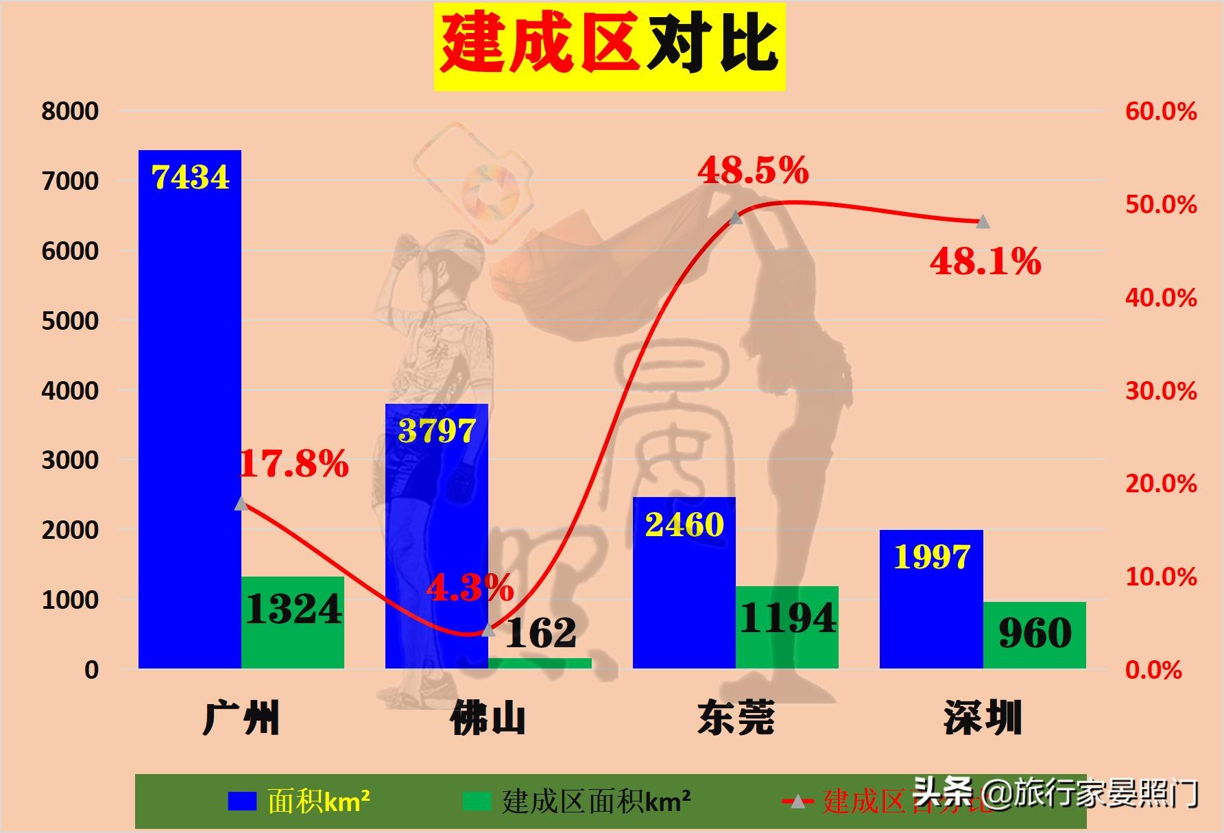 在象征城市城建规模的建成区面积上,国家中心城市广州,不仅不负众望击败后起之秀的深圳,而且足足是深圳的1.38倍。而深圳不仅明显不及省会广州,还败给“直筒子市”的东莞,仅有其的80%。当然,最意外的并不是这些,而是GDP超万亿,实现和广州高度同城发展的佛山,建成区面积却仅有广州的12%,即便是和最大竞争对手东莞相比,也仅有其的13.6%。