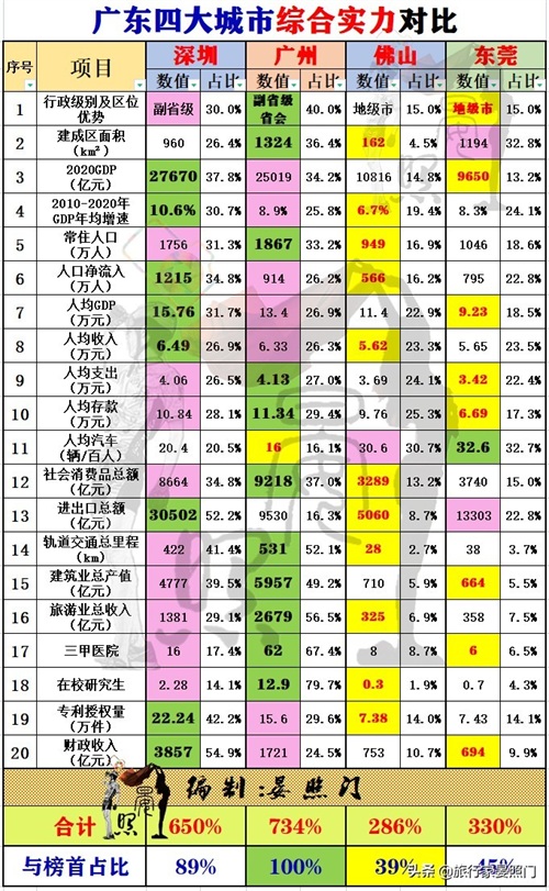 不知不觉中,作为我国第一大经济体+第一大人口的广东四大城市的20项核心数据已经全部罗列完毕,彼此各单项绝对实力以及相互差距势必也已尽收眼底。那么,大家最关心的,也就是关于本文开头的几大悬念自然也就水落石出。