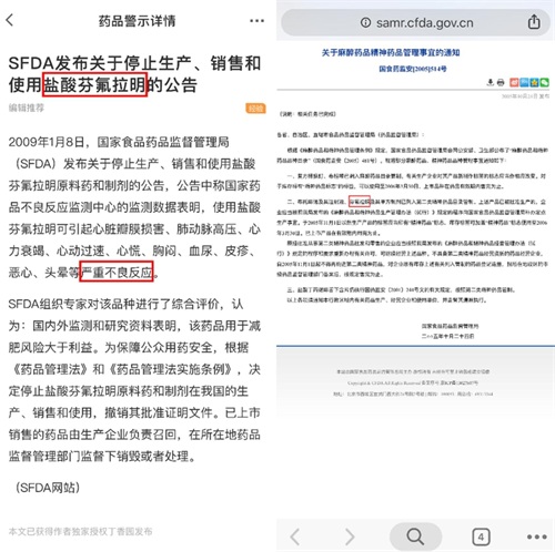 以袋子中那颗最小、印有np字样,含有盐酸芬氟拉明的药丸为例,记者在国家食品药品监督管理总局官网上查询到,2005年国家食药监就已经将其列入精神药品目录管制,并在2009年发布了关于停止生产、销售和使用盐酸芬氟拉明原料药和制剂的公告。在美国食品药品监督管理局网站上也可以查询到,作为减肥药的芬氟拉明于1997年被撤销了上市许可证。大韩新药的网站上也指出,这款白色药片适用于BMI指数超过30的人使用。也就是如果一个人是170cm的身高,那么他的体重要超过90公斤才适合选择服用。如果相对健康的人出于减肥目的来服用的话,最严重的后果将是不可逆转的厌食症和重度抑郁症。“这不是危言耸听”,张立群说。