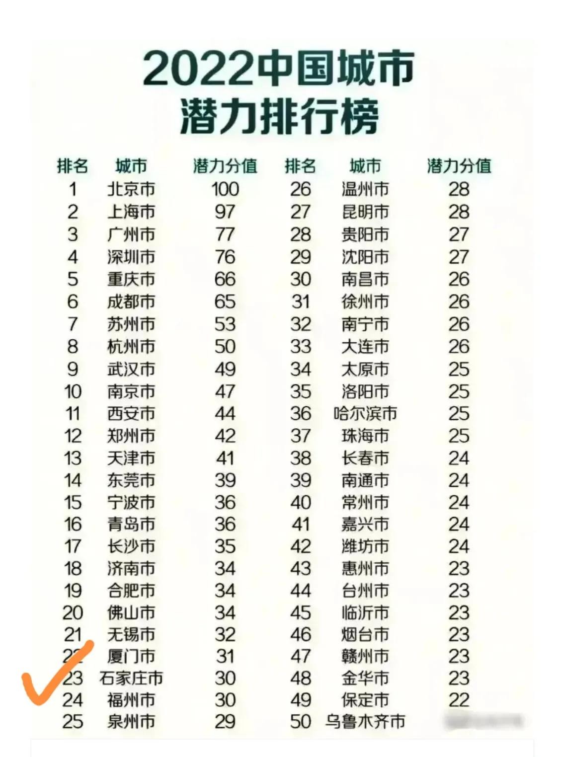 石家庄在中国城市发展潜力排名中位列第23位。