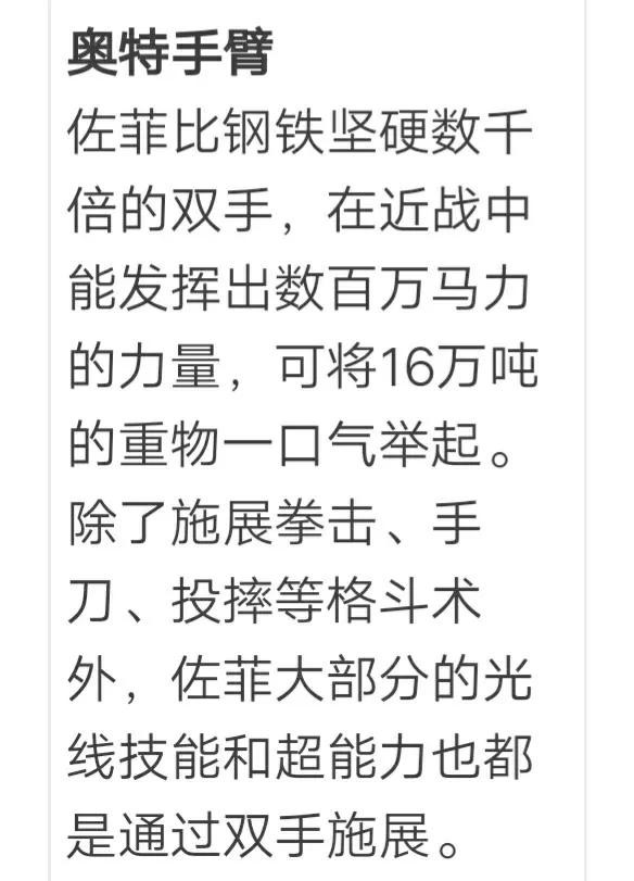 但是,圆谷也曾经这样声明:奥特曼战士的实力是由格斗技巧、战斗经验、肉搏战的强弱、光线技能的破坏力、光线技能的全面性、防御力、速度甚至人间体的战斗力等多方面因素进行分析的。而不是单纯由数据就能决定的。看来,光靠数据来判断佐菲的实力是片面的。那么,小编再综合佐菲的多方面设定与战斗表现来分析一下佐菲的实力: