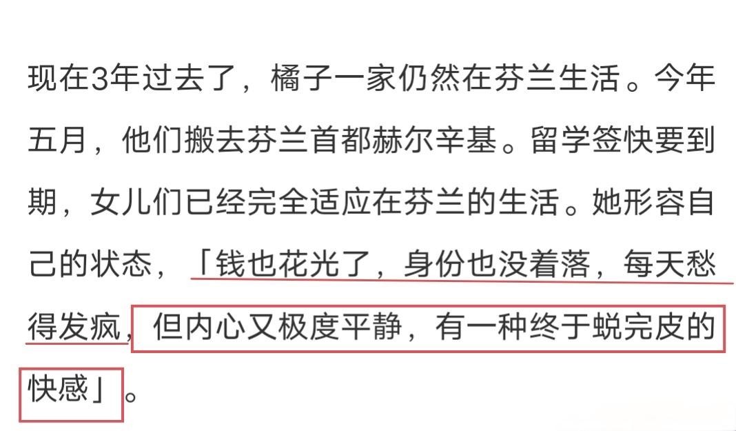 她写的这篇近万字的文章里面,可以读出一些信息,目前他们拿的是芬兰留学签,马上快到期了,还没有合法的身份,三年时间钱也快花完了,唯一的收入来源是国内各种自媒体平台。“钱快花没了,每天愁得发疯,内心又极度平静,有一种终于蜕完皮的快乐”。
