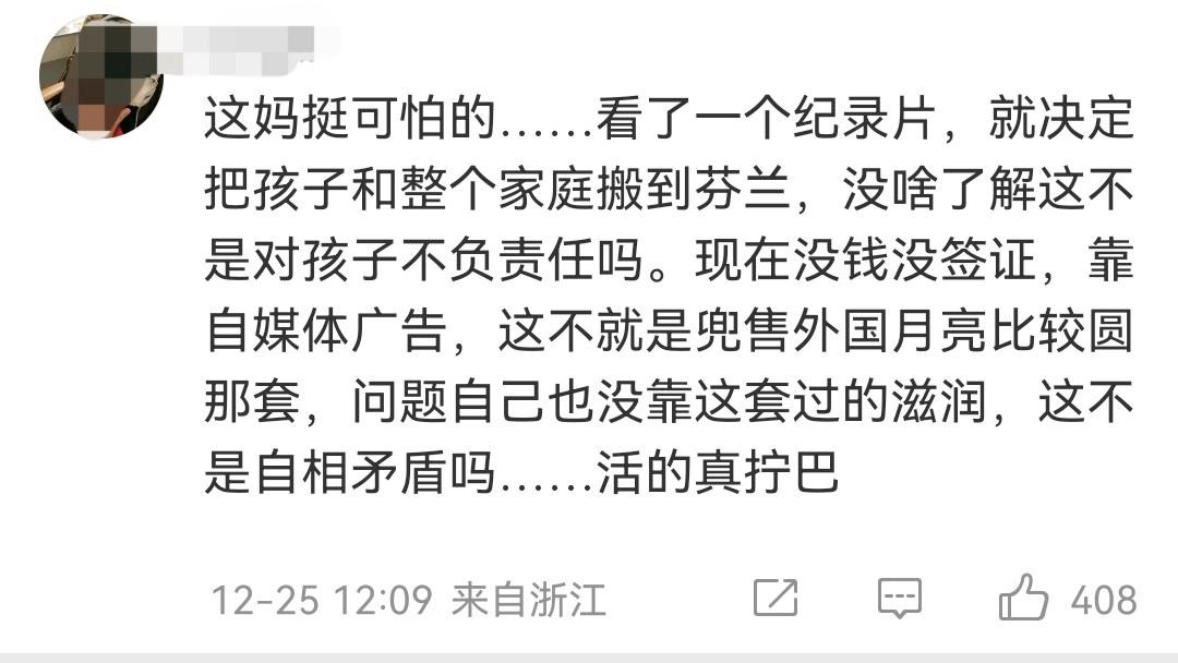 作为两个孩子的母亲,因为看了一部外国纪录片就决定把整个家庭和孩子移民到芬兰,这是负责任的表现吗?已经没钱没签证了,还是靠国内自媒体提供的收入才能勉强生存,活得都这么不如意了,居然还要兜售外国月亮比较圆这套,简直是自相矛盾。网友认为她的做法很可怕。