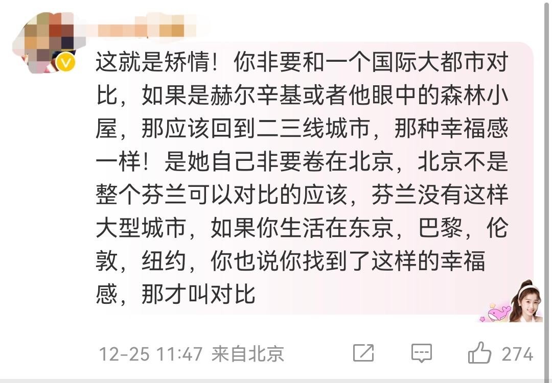 就连大V都忍不住批评这名女博主矫情,在国内自己选择在大城市卷却要责备,想要幸福感又不去二三线城市生活,要是从北京移民纽约、巴黎或东京还可以比,芬兰跟北京没有可比性。