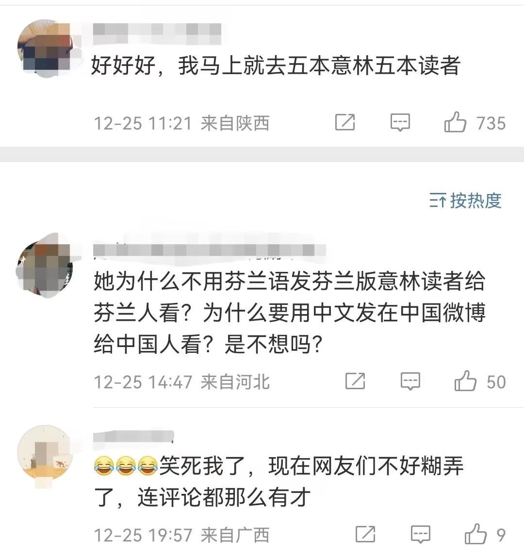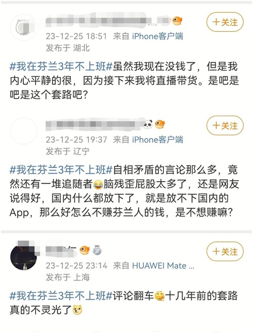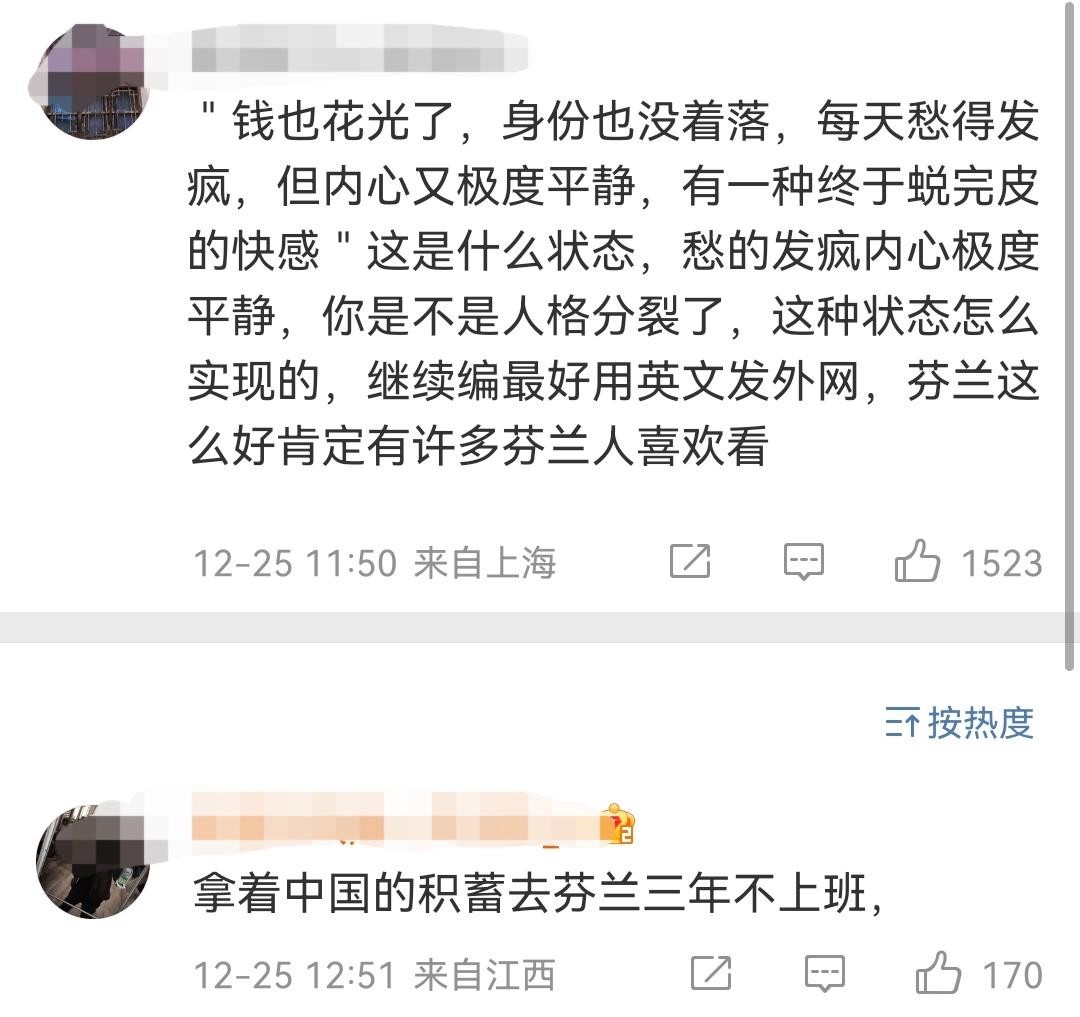 有网友质疑,钱没了身份还拿不到,明明已经很发愁却又说内心极度平静,这是不是人格分裂?既然外边那么好,为什么不用英文在外网发布,难不成是假的?还是外国人不喜欢看这些?居然拿着国内的积蓄跑去芬兰吹嘘三年不上班。