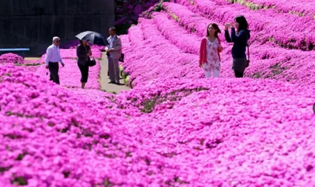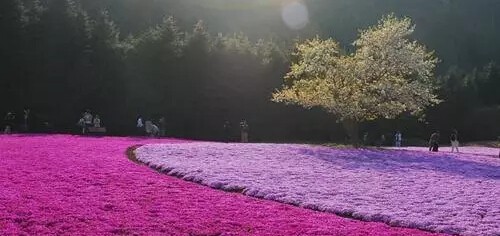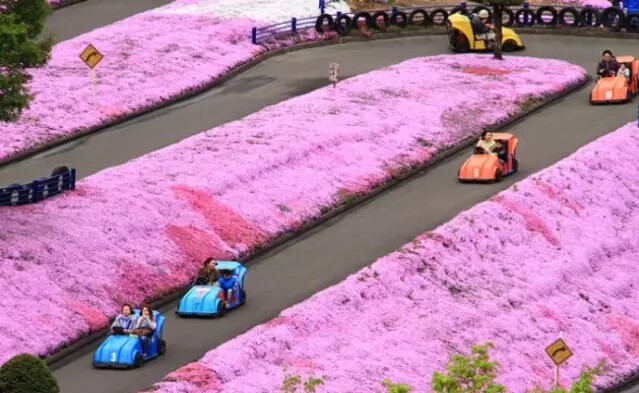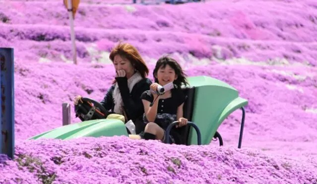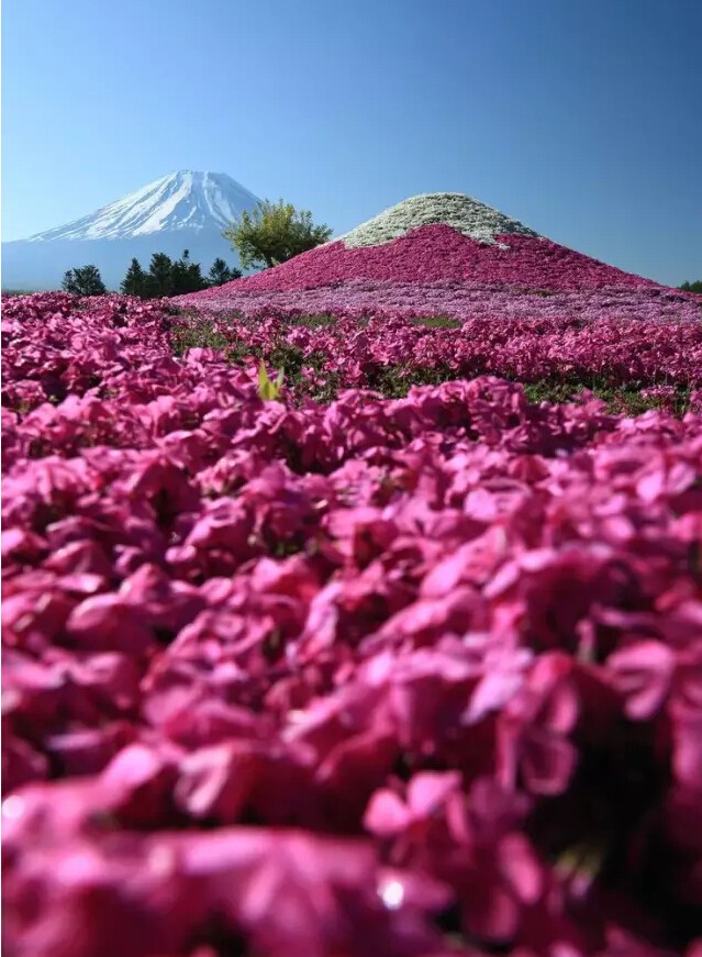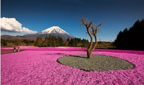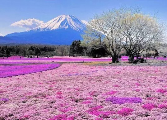 每年富士山脚下都会举办芝樱祭,届时,以富士山为背景,在占地约2.4公顷的会场铺满了芝樱花海,景色美丽而梦幻。满地的粉红芝樱,将大地点缀成一幅粉红彩绘,壮观美丽。