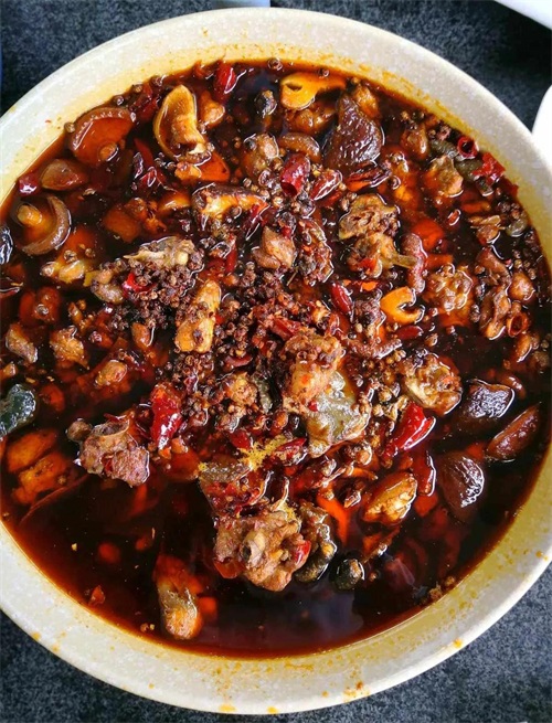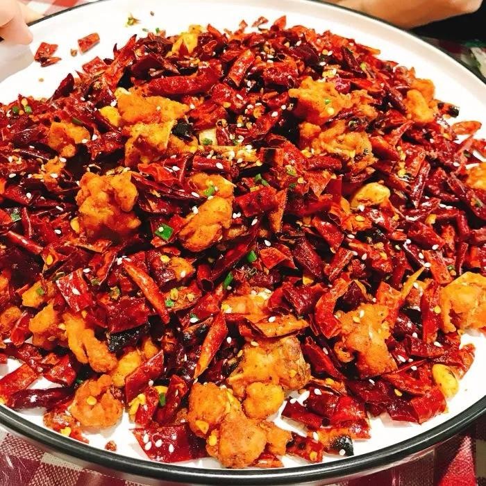 辣子鸡:重庆辣子鸡以麻辣味为主,选用嫩鸡肉,经过油炸后再炒制而成。辣子鸡色泽红亮,鸡肉香酥可口,辣味十足,是重庆江湖菜中的一道经典美食。