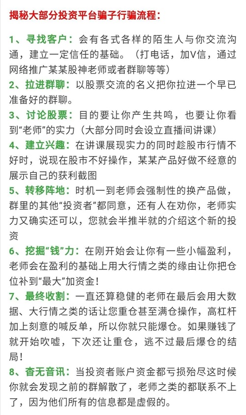 四、微信陌生人、微信上认识的男女朋友,荐股、释放所谓内幕消息之类的,都是骗子的惯用伎俩,其最终目的是通过他们搭建的非法理财平台、钓鱼网站,诱骗受害者在上面投资。个别受害人会在前期获得短暂小额收益,一旦投资数额巨大,网站就会出现打不开的状况,甚至于网站背后的骗子卷款潜逃。