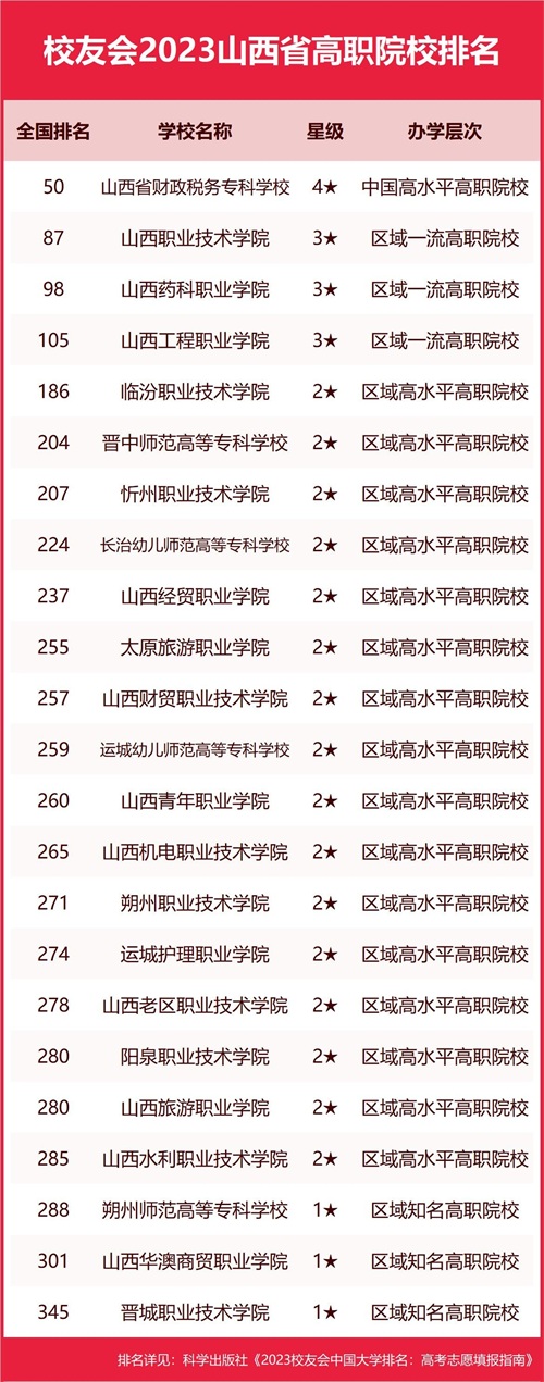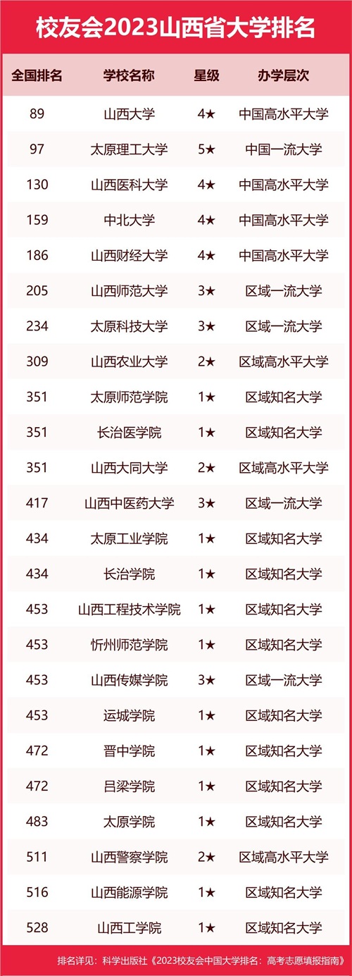校友会2023山西省大学排名,山西大学第一;校友会2023山西省民办大学排名,山西工商学院第一;校友会2023山西省高职院校排名,山西省财政税务专科学校第一。