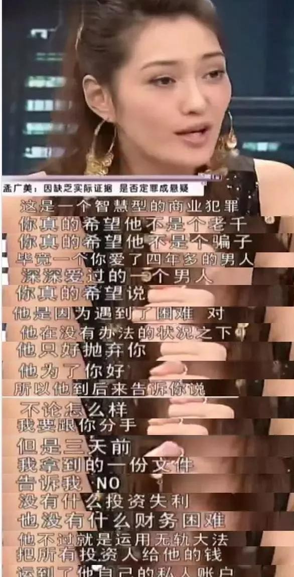 可那些曾经将钱投进来的人却不管孟广美的想法,他们只知道自己投进去的钱拿不回来了,而孟广美就是科拉多身边的女友,所以一纸诉状将孟广美告上了法庭。