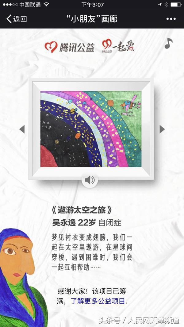 人民网天津8月29日电 今天,不少网友的微信朋友圈被“一块钱”购画刷屏!点开活动链接发现,这是一项由腾讯公益发起的公益活动——“小朋友”画廊。在这里,有许多由不同“小朋友”创作的作品正在出售,每幅售价只有“1元”。只不过,被“买”下来的画并不能带回家,而是可以保存成为手机的壁纸。